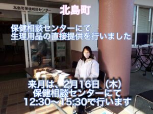 1月24日 北島町保健相談センターにて12:30~15:30で生理用品の提供を行いました。
